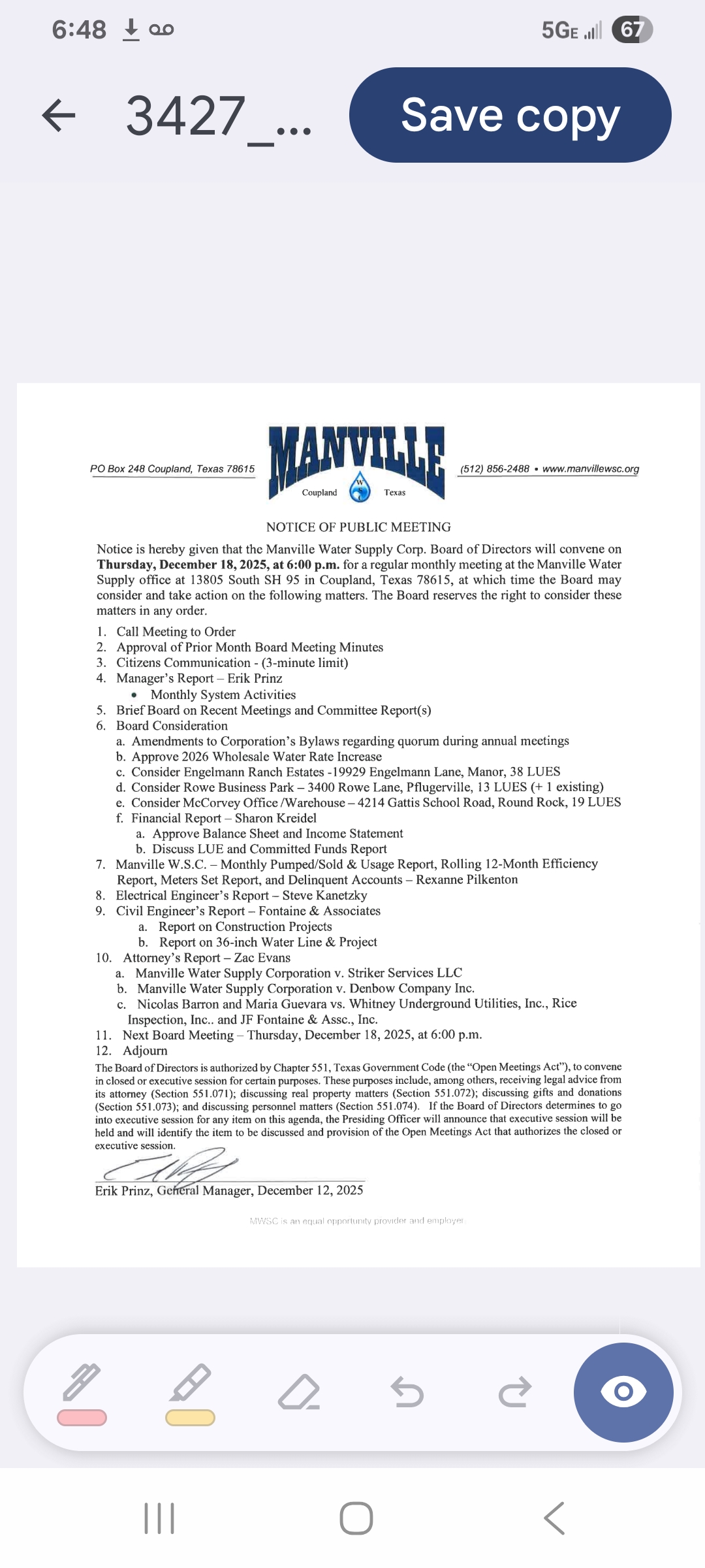 Manville WSC Board Meetings will be conducted at the Coupland Office, located at 13805 South SH 95, the 3rd Thursday of each month at 6:00pm.